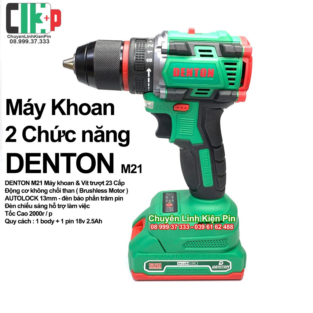 - Tên sản phẩm: Thân Máy Khoan 2 Chức Năng Denton 21V kèm Pin Denton 5S2P 21V-2.5Ah